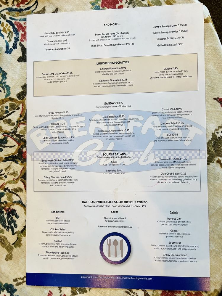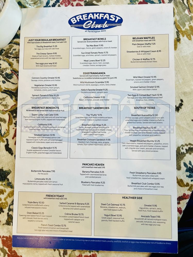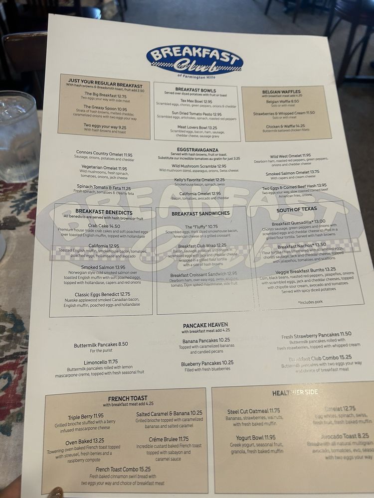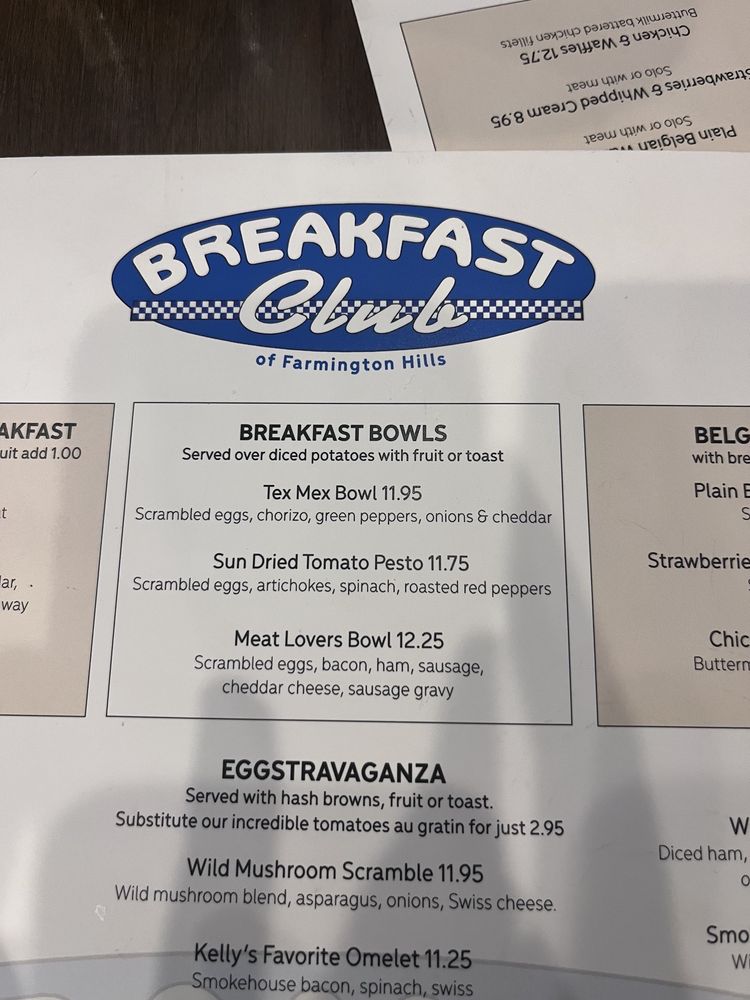Introducing the menu at Breakfast Club, a versatile restaurant offering takeout, reservations, delivery, and a range of vegetarian and vegan options. Located at 38467 W 10 Mile Rd Farmington Hills, MI, this spot is perfect for breakfast, brunch, and lunch. The starters include tempting options like Jumbo Sausage Links, Thick Sliced Smokehouse Bacon, and Scottish Porridge. For those looking for healthier choices, the Great & Fit Start section offers dishes like Mini Eggwhite Spinach Omelet and Portobella Au Gratin. Fresh Garden Salads like Traverse City Salad and Club Cobb are also available. The reviews from customers rave about the delicious food and excellent service, making Breakfast Club a must-visit for a satisfying meal experience.